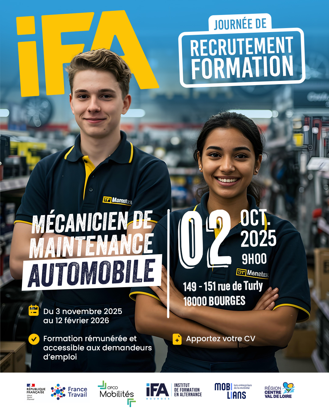 Envie de travailler dans l’automobile ? L’IFA Bourges vous invite à une journée d’information le 2 octobre 2025 pour découvrir la formation CQP Mécanicien de Maintenance Automobile.