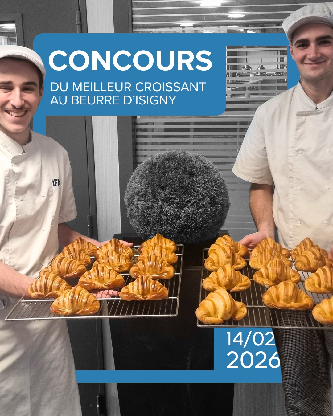 L’IFA s’illustre au Concours du Meilleur Croissant au Beurre d’Isigny Sainte-Mère avec la 1ère et la 3ème place. Tom Crétois est qualifié pour la finale nationale de viennoiserie, un vrai succès pour nos apprentis boulangers !