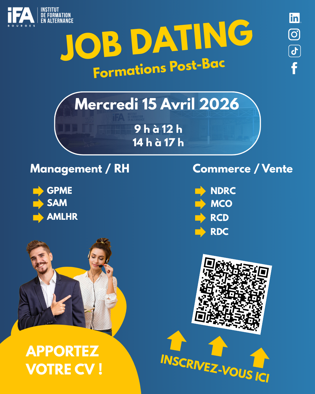 👉 L’IFA Bourges organise un Job Dating spécial Post-Bac le 15 avril 2026 : coaching CV, préparation aux entretiens le matin et rencontres recruteurs pour BTS et Bachelor en alternance l’après-midi. 🚀